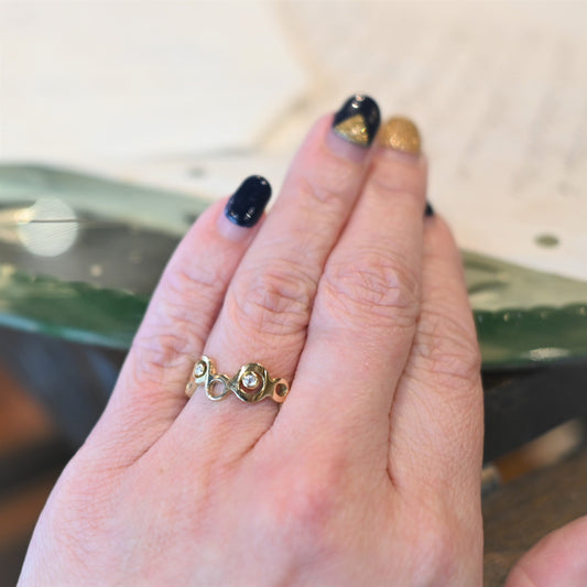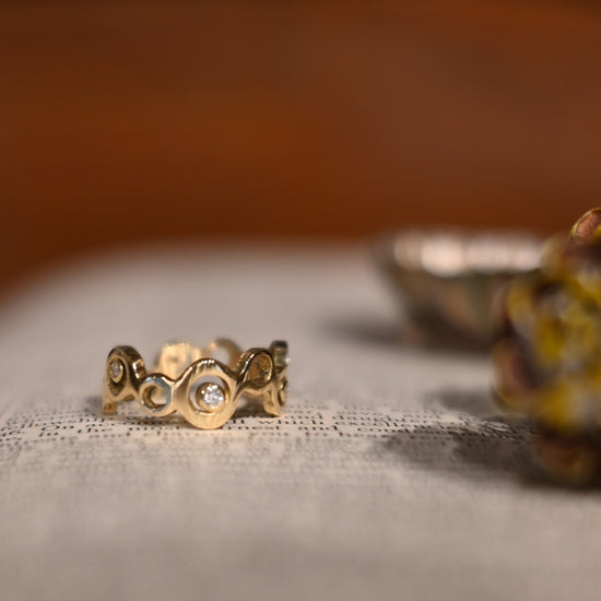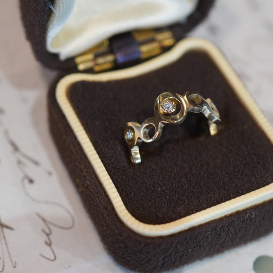 アシンメトリーに留められているダイヤモンドがユニークな表情。